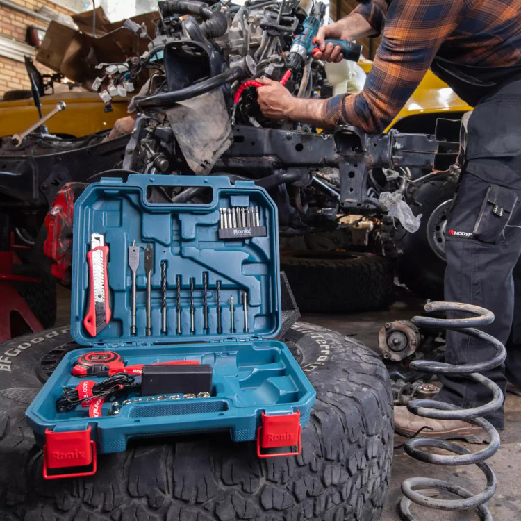 ست ترکیبی رونیکس مدل RS-8013، مجموعه کاملی از دریل شارژی قدرتمند 12 ولت 8012C رونیکس و انواع سریها و متعلقات مورد نیاز است که در یک کیف ضد ضربه BMC قرار میگیرد.