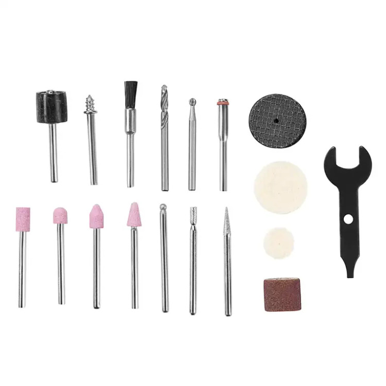 -شامل 26 عدد متعلقات کاربردی مختلف برای سنبادهزنی، برش، صیقلدادن، کندهکاری، پرداخت و تمیز کردن سطوح مختلف چوبی و فلزی