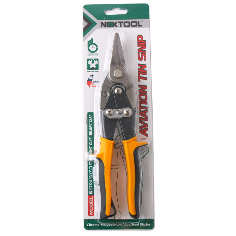 قیچی ورق بر، همانگونه که از اسم آن پیداست، نوعی ابزار دستی ایدهآل جهت برش ورقهای فلزی، ورقهای UPVC ، حلقههای سیمی و برش آلومینیوم است. بعلت سختی برشهای مایل به سمت راست و یا سمت چپ در برشکاری ورقهای فلزی، قیچیهای ورق بر به سه نوع برش مستقیم، برش راست و برش چپ تقسیم بندی میشوند. قیچی ورقبر NEXTOOL مدل NT2905 یکی از قیچیهای با کیفیت جهت برش ورق در جهت مستقیم بوده است که با رنگ زرد از بقیه قیچیهای ورق بری متمایز شده است. افراد راست دست و چپ دست نیز بطور کل از این قیچی جهت برش ورقهای فلزی استفاده مینمایند. سایز این قیچی 250 میلیمتر است. این قیچی دارای فکهای سختکاری شده ( فولادی ) و ساخته شده از آلیاژ کروم مولیبنیوم (CR-MO) است تا عمر و مقاومت این قیچی درمقابل برش ورقهای فلزی افزایش یابد. دسته این قیچی خوش دست و ارگونومیک بوده و همچنین دارای روکش نرم جهت جلوگیری از عرق کردن دست به مدت طولانی و نیز جلوگیری از لغزش قیچی ورق بر در داخل دست هست. بر روی این قیچی یک قفل کن نیز تعبیه شده است تا در زمان عدم کار با این قیچی جهت افزایش ایمنی، براحتی بتوان آن را قفل نمود. طراحی بدنه این قیچی به نحوی است که با حداقل فشار بتوان حداکثر برش بر روی ورقهای فلزی را بدست آورد تا در مصرف انرژی کاربر صرفهجویی شود. با داشتن قابلیت فنریت بر روی دستهها، پس از هر برش، دسته به حالت بازشده برمیگردد تا هنگام برش، کاربر مجدد فقط فشار را بر روی دسته ایجاد نماید و دیگر نیازی به صرف انرژی برای باز نمودن دستهها ندارد. این قیچی دارای استاندارد GS و TUV جهت افزایش اطمینان کاربر از این کالا است. این قیچی ساخت کشور تایوان و دارای استاندارد بین المللی ISO9001:2000 و استاندارهای ANSI / ASME B107 .16-1998 & DIN 6438/11.71 در اروپا هست.