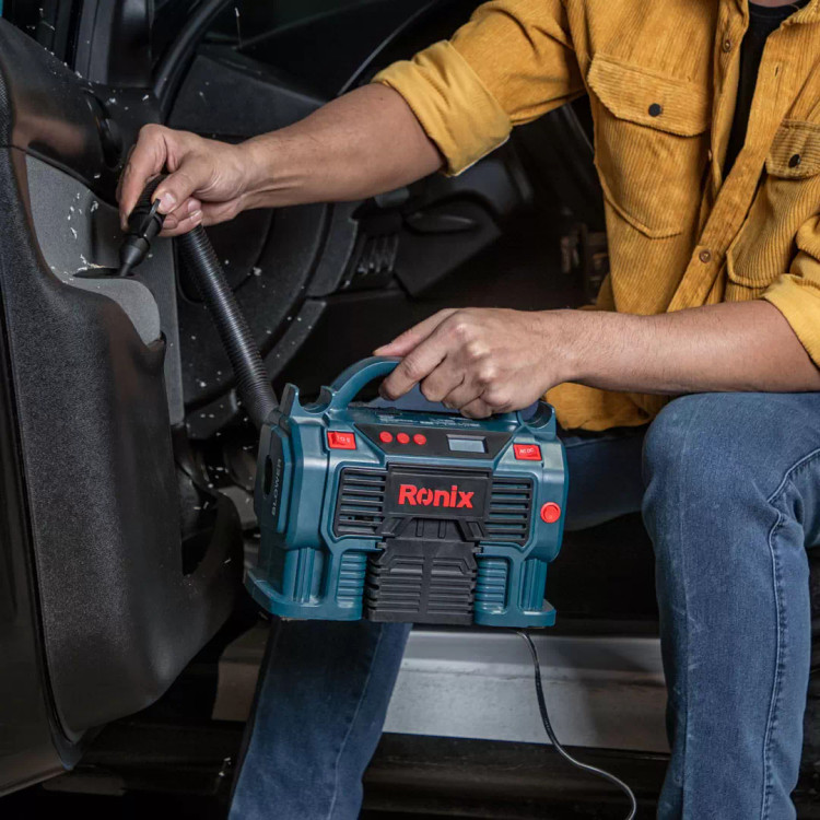 مینی کمپرسور باد RH-4261 رونیکس، با نازل و مبدلهای مختلف، برای تمیزکاری داخل خودرو، بادکردن توپ، تشک و سایر تجهیزات بادی به شما کمک کند. این مینی کمپرسور باد، قابلیت استفاده با ولتاژ 220 ولت برق شهری و 12 ولت فندکی خودرو را دارد. این پمپ باد رونیکس، مجهز به یک نازل باد 81 سانتیمتری و خرطومی بلوور 36 سانتیمتری است.