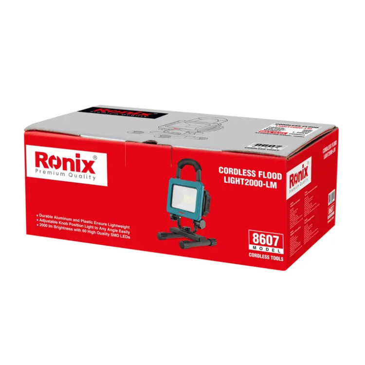 با نورافکن شارژی نسل جدید سری 86 رونیکس، همه جا را مثل روز، روشن کنید! نورافکن شارژی 8607 رونیکس، یک چراغ LED با 60 عدد LED SMD باکیفیت دارد و توان روشنایی 2000 لومن را تامین میکند. منبع تغذیه این ابزار شارژی، یک باتری 20 ولت 2000 میلی آمپر ساعتی لیتیوم-یونی است که 2 ساعت با شارژ کامل کار میکند.