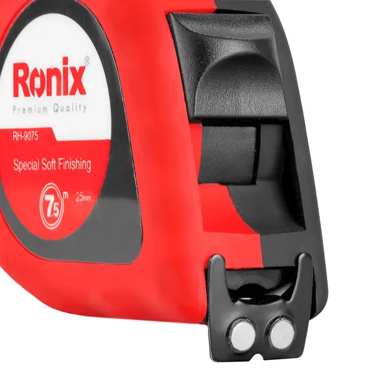 در طراحی متر روکش دار 7.5 متری RH-9075 رونیکس یک گیره فلزی در نظر گرفته شده تا بتوان به راحتی آن را به کمربند یا جیب لباس کار متصل کرد. از دیگر ویژگیهای این متر برخورداری از قلاب دو طرفه آهن ربایی است که امکان کاربری در هر دو طرف را فراهم می کند.